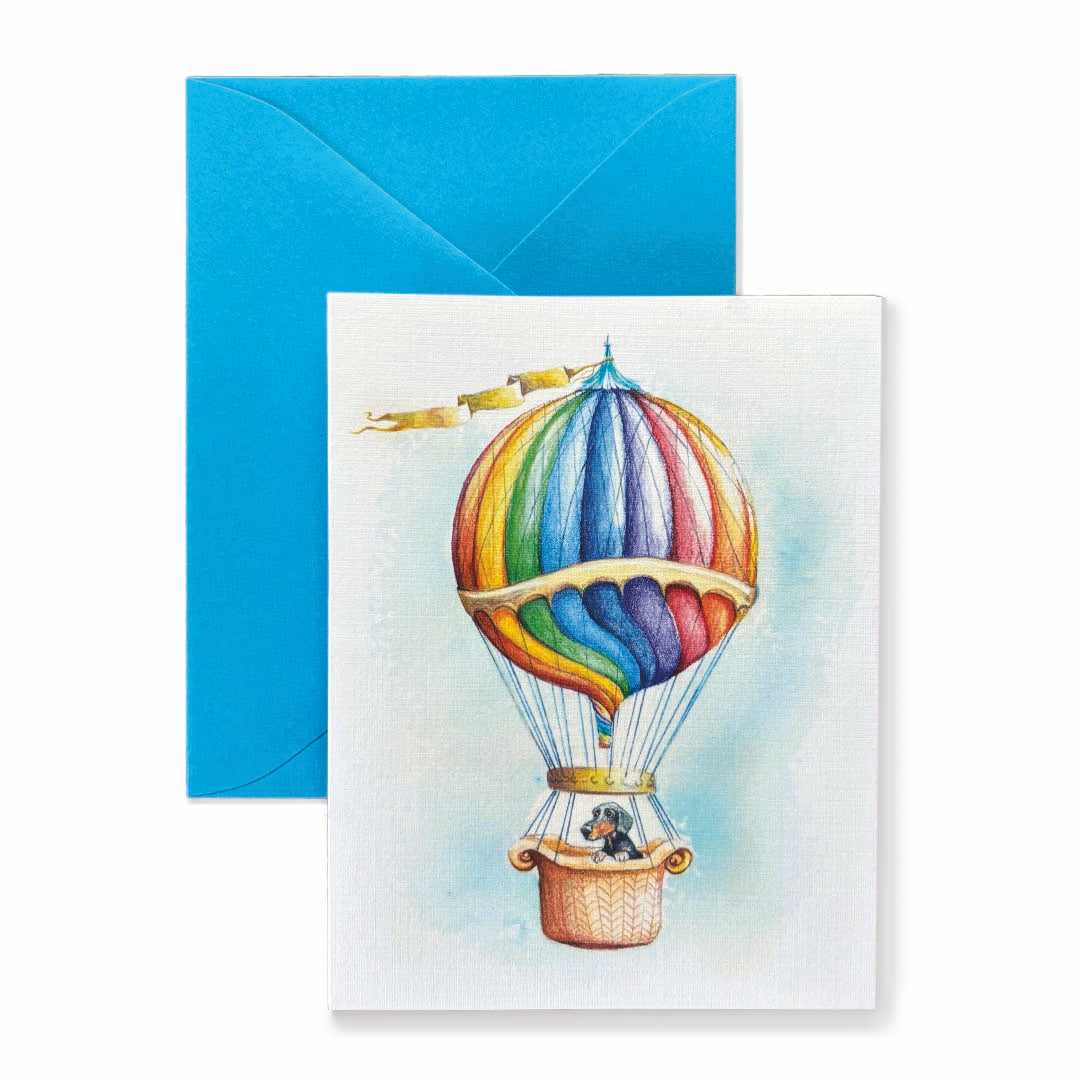 Dog Watercolor Greeting Cards - A journey over the Rainbow Bridge in a rainbow balloon