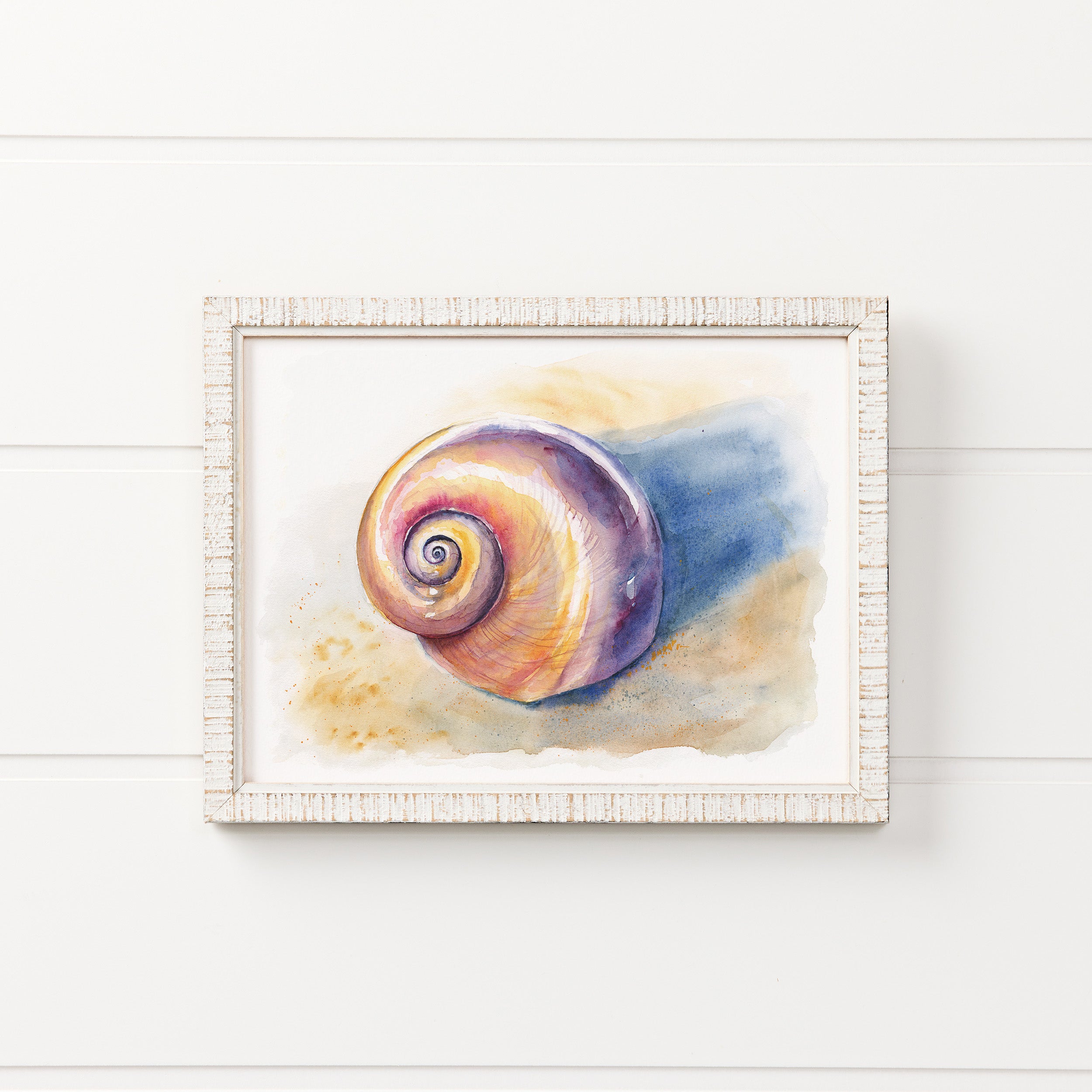 Bring a touch of softness to your home with nature-inspired watercolor prints. This moon snail was painted in Kiawah Island, South Carolina.