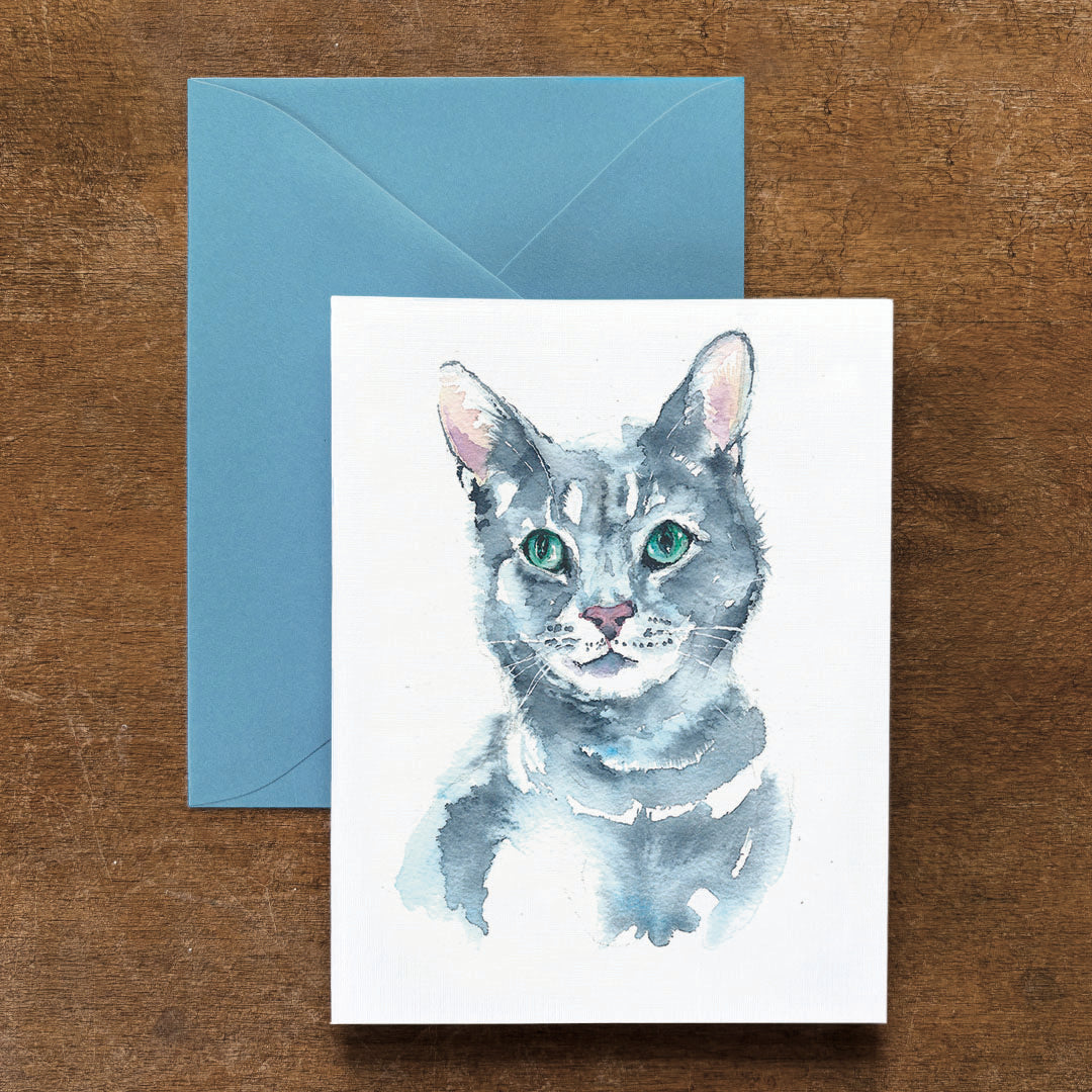 Celebrate life’s special moments with beautifully crafted cat watercolor greeting cards. These are designed especially for your loved ones who adore gray cats. Each card is a print of an original commissioned pet portrait watercolor, conveying the individuality of genuine family companions. Use these furry friend illustrations for sending birthday wishes, thank you notes, sympathy, or just a thoughtful message.