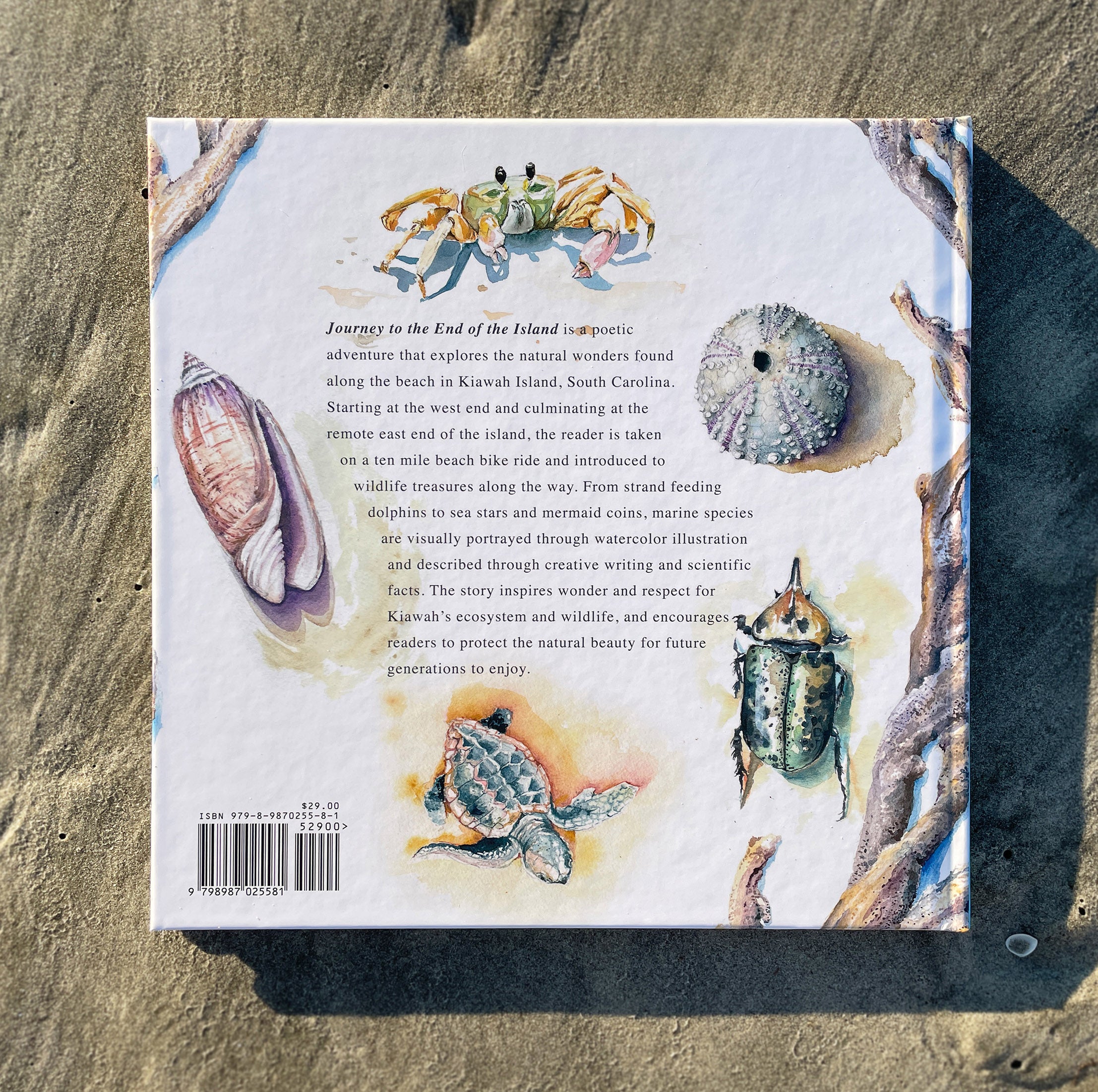 Journey to the End of the Island is a poetic adventure that explores the natural wonders found along the beach in Kiawah Island, South Carolina. Starting at the west end and culminating at the remote east end of the island, the reader is taken on a ten mile beach bike ride and introduced to wildlife treasures along the way. From strand feeding dolphins to sea stars and mermaid coins, marine species are visually portrayed through watercolor illustration and described through creative writing and scientific facts. The story inspires wonder and respect for Kiawah’s ecosystem and wildlife, and encourages readers to protect the natural beauty for future generations to enjoy.